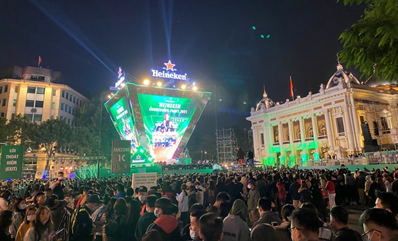 Chương trình "Vũ khúc ánh sáng - Countdown 2021" diễn ra tại trước Nhà hát Lớn Hà Nội thu hút đông đảo bạn trẻ tới dự. |
