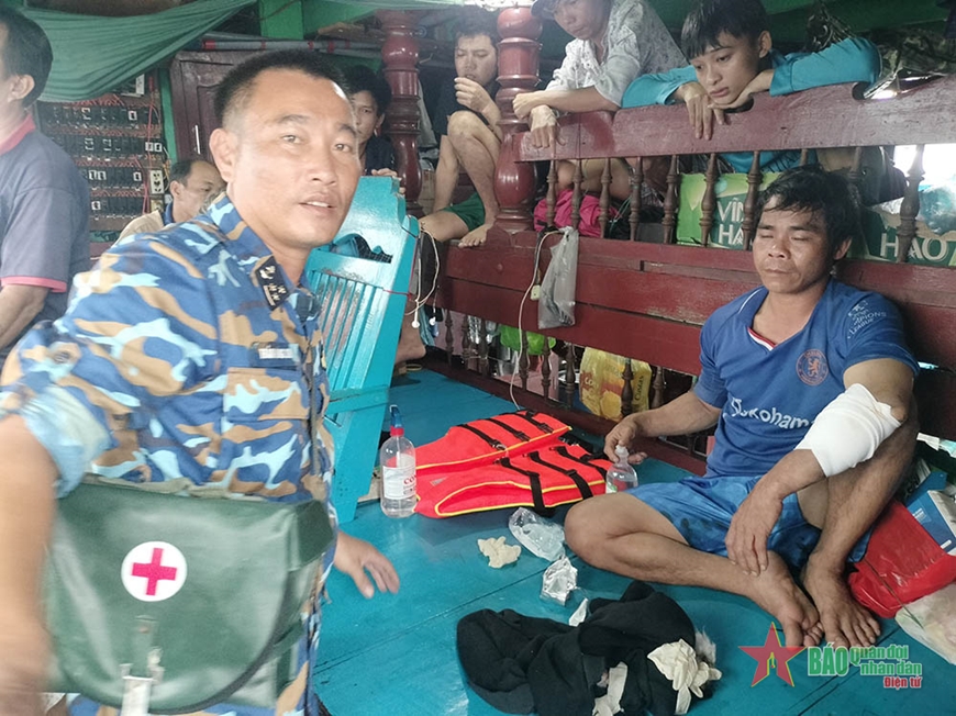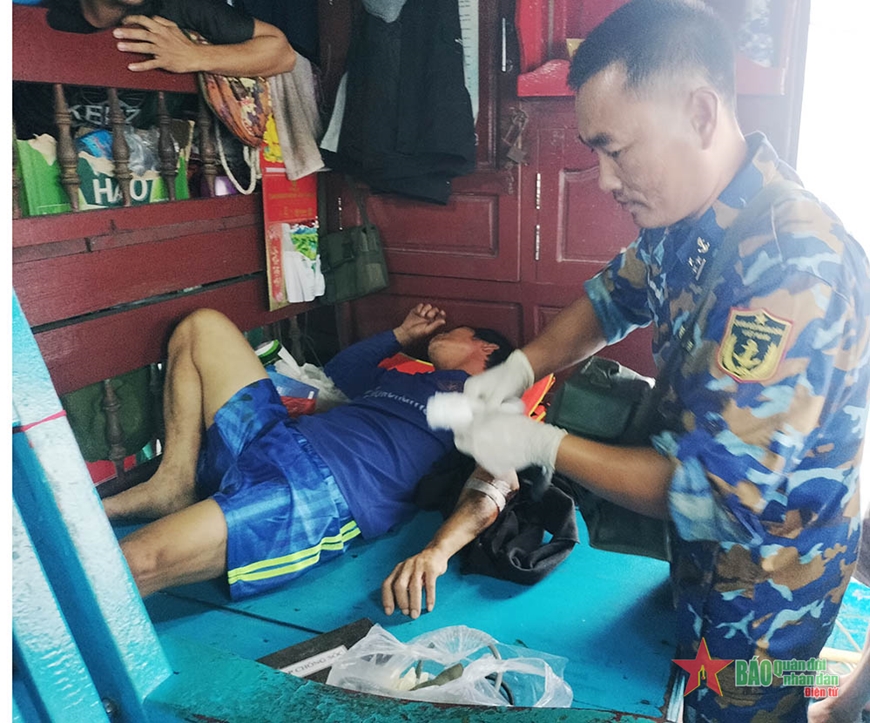 Tổ quân y đã kiểm tra tình trạng vết thương, tiến hành ga rô cầm máu, rửa vết thương, sát khuẩn và gây tê để khâu vết thương 6 mũi bằng chỉ lanh; sát khuẩn vết thương sau khâu, băng ép ổn định; đồng thời cấp thuốc kháng sinh, giảm đau, chống phù nề, vitamin, băng gạc… và hướng dẫn cách thay băng cho ngư dân.