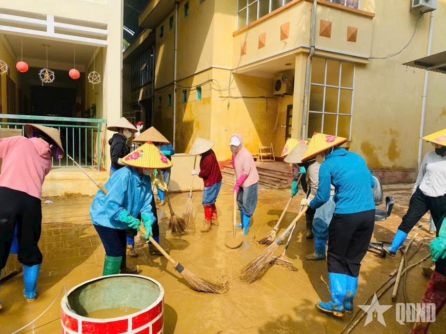 Giáo viên Trường mầm non Sơn Ca cùng bộ đội Lữ đoàn Pháo binh 382 (Quân khu 1) dọn dẹp bùn đất tại Trường mầm non Túc Duyên chiều 11-10.