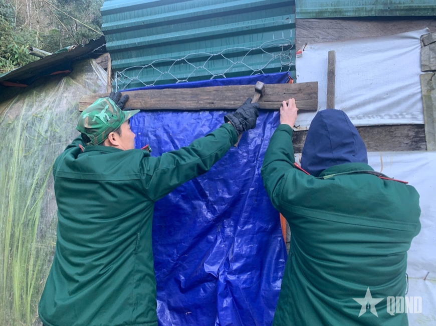 | Bộ đội Biên phòng tuyên truyền, vận động và giúp người dân gia cố nhà cửa, che chắn chống rét. |