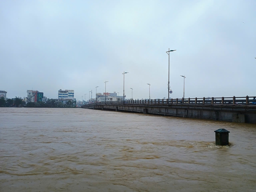Nước lũ dâng cao uy hiếp an toàn công trình cầu Châu Ổ tại Quảng Ngãi.