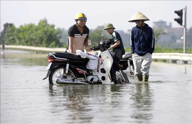 Nhiều phương tiện bị chết máy khi đi qua đoạn đường ngập nước tại tỉnh lộ 305C đoạn qua xã Sơn Đông. |