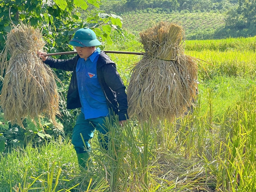 Đoàn viên thanh niên tỉnh Cao Bằng giúp người dân thu hoạch lúa chạy bão. |