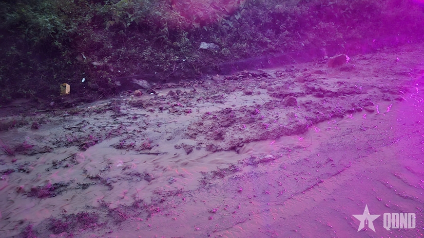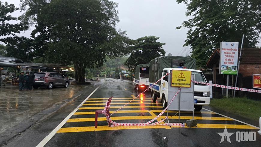 | Các lực lượng chức năng chốt chặn cách vị trí sạt lở 2km. |