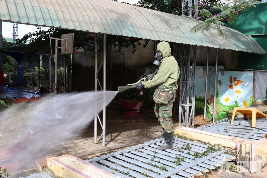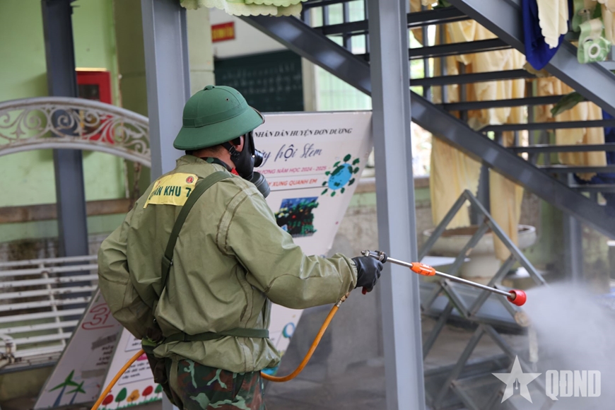 Để bảo đảm vệ sinh môi trường, không cho dịch bệnh bùng phát, Quân khu 7 đã điều động lực lượng, phương tiện đặc chủng của Tiểu đoàn Phòng hóa 38, Bộ Tham mưu Quân khu thực hiện nhiệm vụ. Tại đây, các cán bộ, chiến sĩ sẽ tiến hành phun khử khuẩn, tiêu độc các khu vực có nguy cơ ô nhiễm, nhất là những nơi vừa bị ngập nặng.