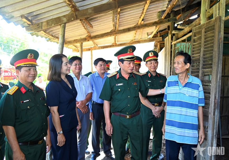 Thiếu tướng Nguyễn Minh Triều, Phó tư lệnh Quân khu 9 thăm hỏi gia đình được hỗ trợ nhà. |