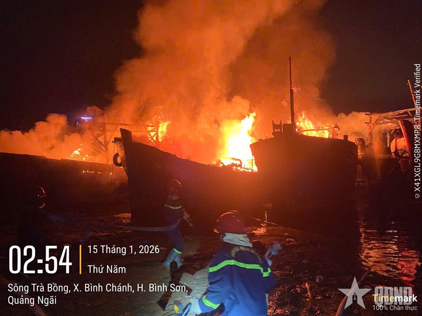 Khoảng 1 giờ ngày 15-1, tại bến neo đậu sông Trà Bồng, thôn Mỹ Tân (xã Bình Sơn, tỉnh Quảng Ngãi) xảy ra một vụ cháy lớn khiến 4 tàu cá của bà con ngư dân ở các xã Vạn Tường và Bình Sơn bị thiệt hại nặng.