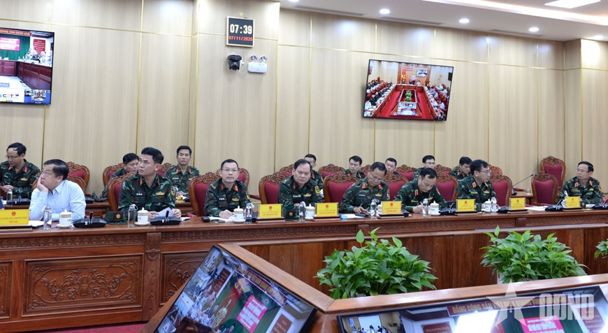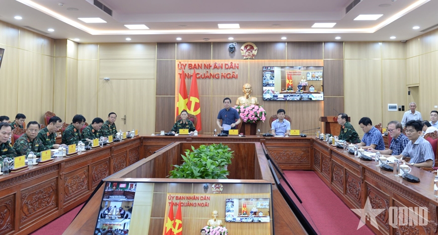 Thượng tướng Phạm Trường Sơn, Phó tổng Tham mưu trưởng Quân đội nhân dân Việt Nam (trái) dự hội nghị trực tuyến tại điểm cầu UBND tỉnh Quảng Ngãi.