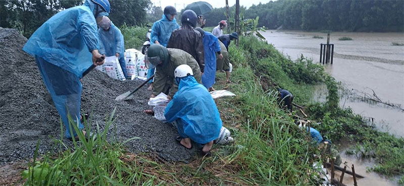| Dân quân phối hợp cùng các lực lượng địa phương gia cố ta luy đập tại hồ Nam Bình Thượng, xã Bình Sơn. |