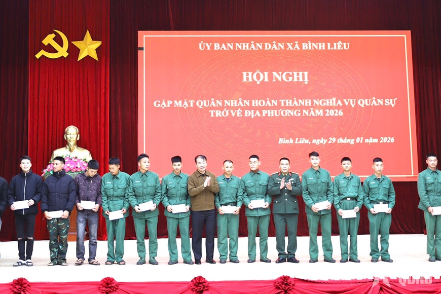| Lãnh đạo xã Bình Liêu trao quà động viên các quân nhân hoàn thành nghĩa vụ quân sự trở về địa phương. |