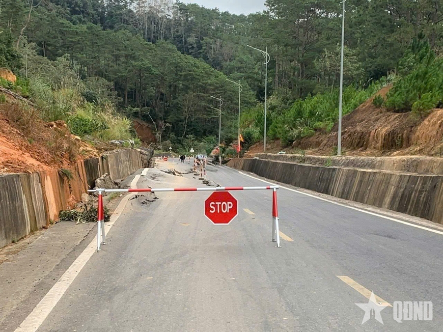 Tại hiện trường cho thấy, chỉ còn một nửa phần đường có thể tạm thời bảo đảm cho các phương tiện di chuyển. Các lực lượng chức năng đã căng dây, cắm biển cảnh báo và hướng dẫn các phương tiện di chuyển chậm, tránh khu vực nguy hiểm.