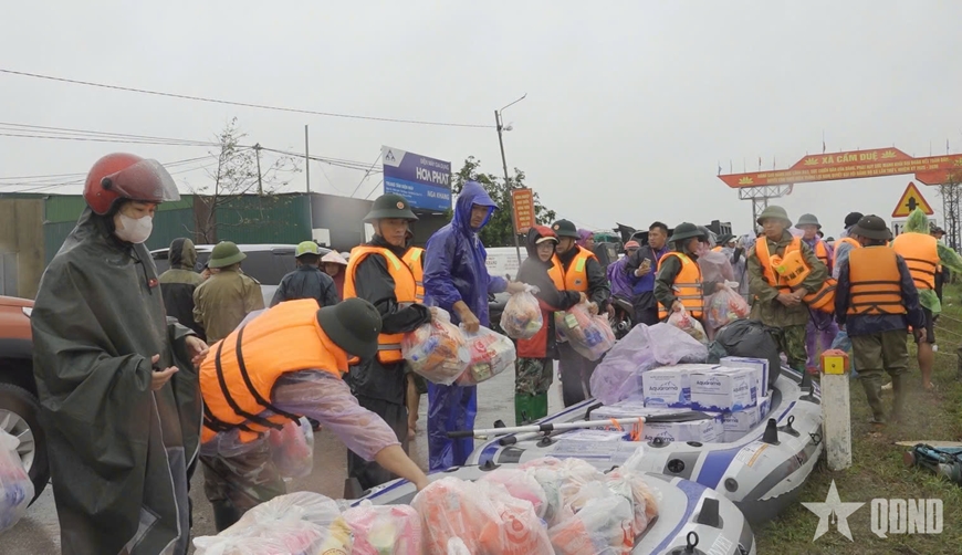 | Các lực lượng tiếp tế lương thực hỗ trợ những vùng ngập sâu. |