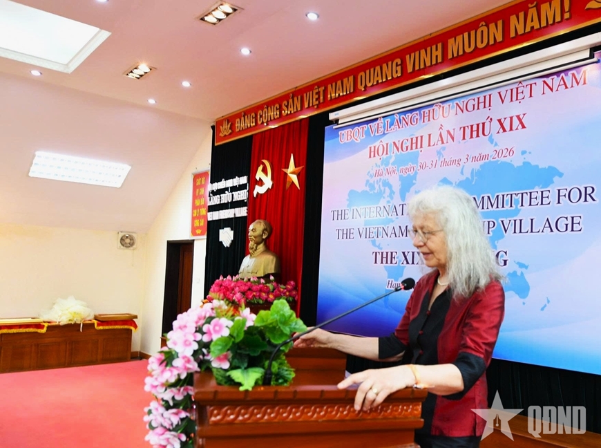 Bà Rosemarie Mizo, Chủ tịch Ủy ban quốc tế kiêm Chủ tịch Ủy ban quốc gia Cộng hòa liên bang Đức về Làng Hữu nghị Việt Nam phát biểu tại hội nghị.