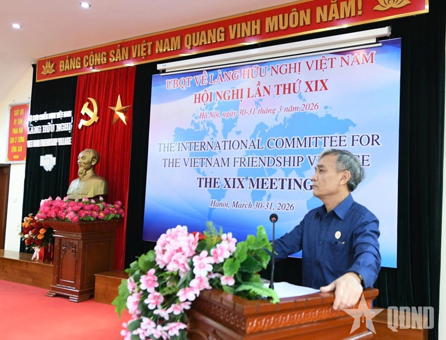 | Thượng tướng Phạm Hồng Hương, Phó chủ tịch Hội Cựu chiến binh Việt Nam, Chủ tịch Ủy ban quốc gia Việt Nam về Làng Hữu nghị Việt Nam phát biểu tại hội nghị. |