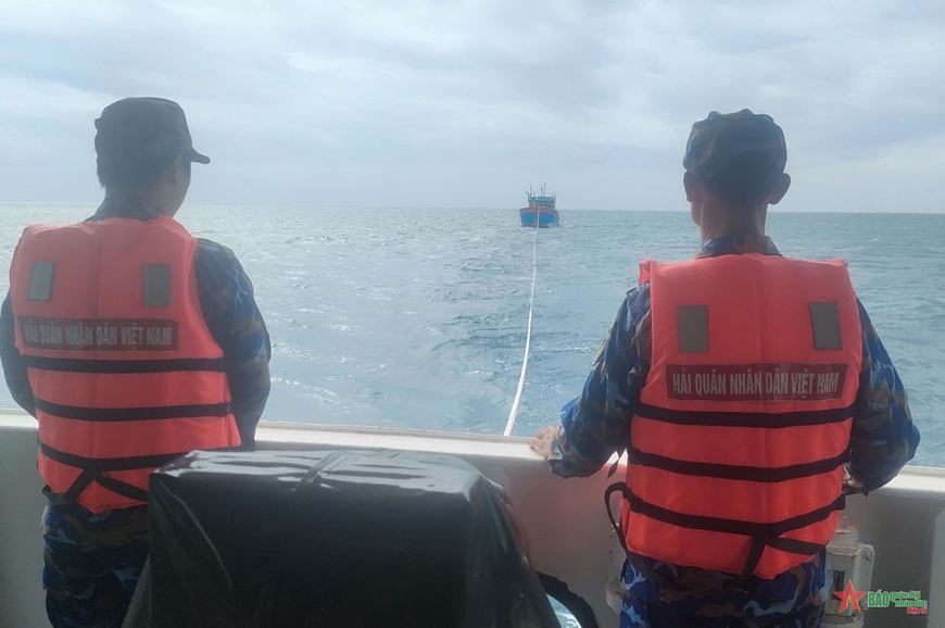 | Tàu 417 lai kéo tàu cá bị hỏng máy. |