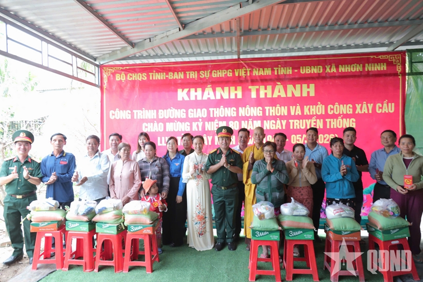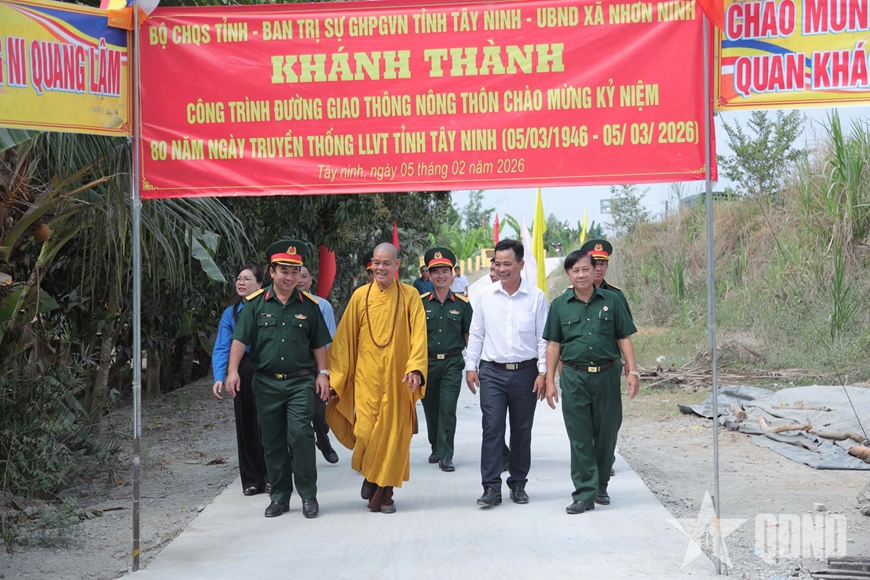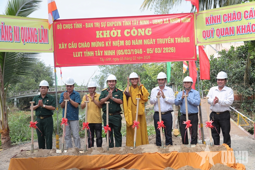 Đồng thời, Bộ CHQS tỉnh phối hợp với Ban Trị sự Giáo hội Phật giáo Việt Nam tỉnh Tây Ninh và UBND xã Nhơn Ninh khởi công xây dựng công trình cầu giao thông nông thôn tại ấp Xóm Cò. Đây là những công trình chào mừng kỷ niệm 80 năm Ngày truyền thống LLVT tỉnh Tây Ninh (5-3-1946 / 5-3-2026).