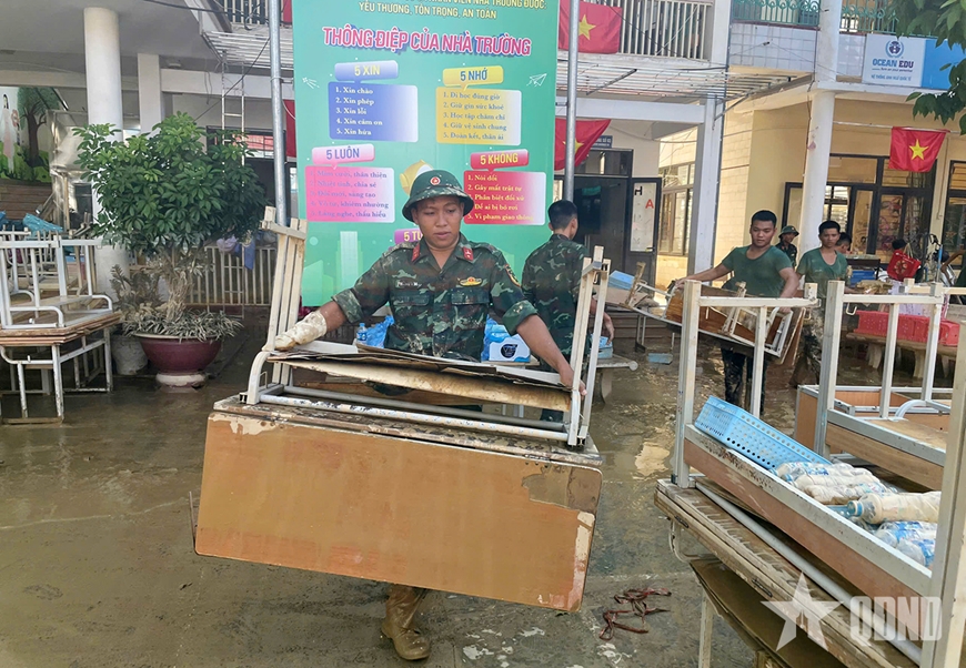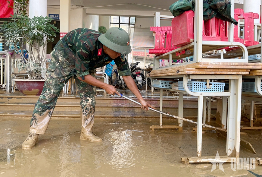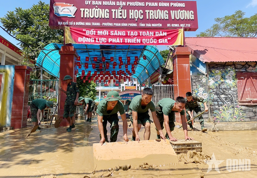 Trường Tiểu học Trưng Vương là một trong những điểm trường chịu hậu quả nặng bởi hoàn lưu bão; trung bình mực nước ngập sâu lên tới 1,5m. Nhà trường đã huy động cán bộ, giáo viên nước rút đến đâu dọn dẹp đến đó nhưng gặp rất nhiều khó khăn do đa phần đều là nữ giới. Đồng hành cùng các thầy cô giáo, cán bộ, chiến sĩ Lữ đoàn 210 đã có mặt từ sớm để hỗ trợ làm sạch phòng học, lau chùi bàn ghế, dọn một lượng lớn bùn đất, rác thải, đảm bảo vệ sinh, an toàn.