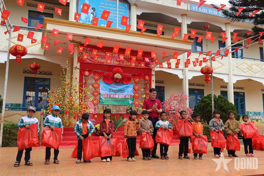 | Cán bộ, sinh viên Trường Đại học Khoa học xã hội và Nhân văn chúc Tết cán bộ, chiến sĩ Đồn biên phòng Đắk Đam, tỉnh Lâm Đồng. |