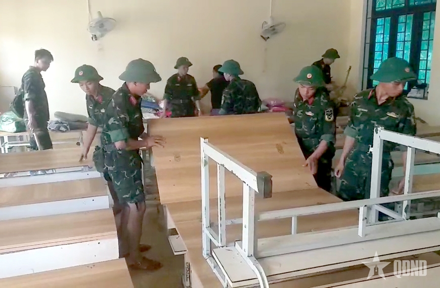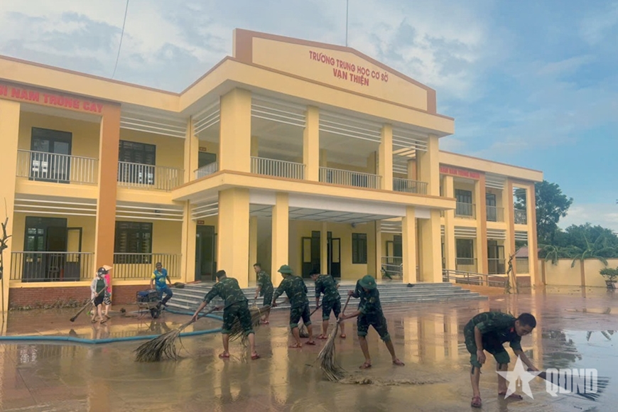 Tham gia khắc phục hậu quả ngập lụt còn có các lực lượng tại chỗ của địa phương như: Công an, Dân quân tự vệ, đoàn viên, thanh niên và các thầy cô giáo nhà trường. Bộ đội cùng các lực lượng đã tổ chức đùn đẩy bùn đất ra khỏi các phòng học và sân trường, xối rửa bàn ghế, đồ dùng, các trang thiết bị dạy học; tổ chức thu dọn bùn đất, rác thải, vệ sinh sạch sẽ khu vực trường học đảm bảo để các cháu học sinh có thể vào học được ngay sau khi nước rút.