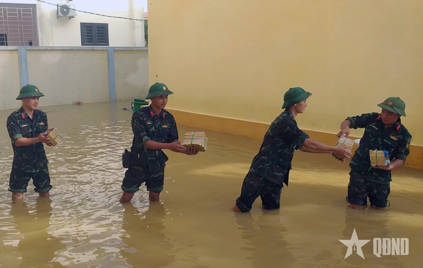 Chiều 1-10, Bộ CHQS tỉnh Thanh Hóa huy động khẩn cấp 200 cán bộ, chiến sĩ thuộc Trung đoàn 762 và Ban chỉ huy phòng thủ Khu vực 5 - Tĩnh Gia đến các địa bàn trọng điểm ngập lụt giúp dân khắc phục hậu quả mưa lũ.