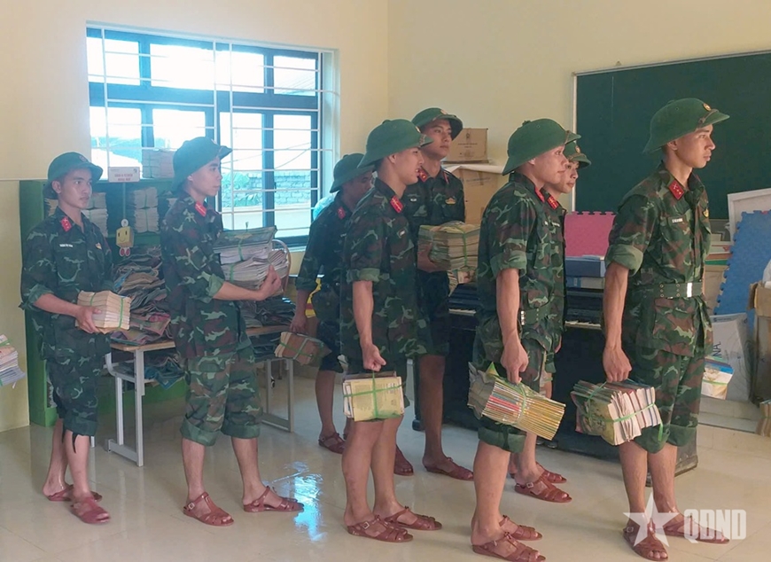 Bộ đội chuyển tài liệu sách vở về phòng thư viện. |