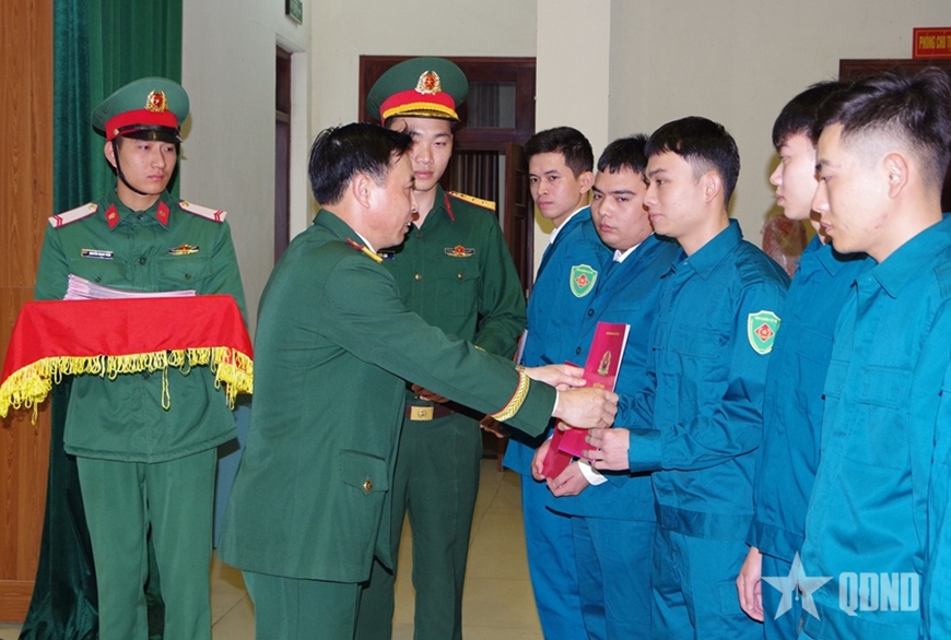 Đại tá Phạm Văn Sâm, Phó bí thư Thường trực Đảng ủy, Chính ủy Bộ CHQS tỉnh Thanh Hóa trao Quyết định cho các chiến sĩ DQTT tại Ban chỉ huy phòng thủ Khu vực 1 - Triệu Sơn.