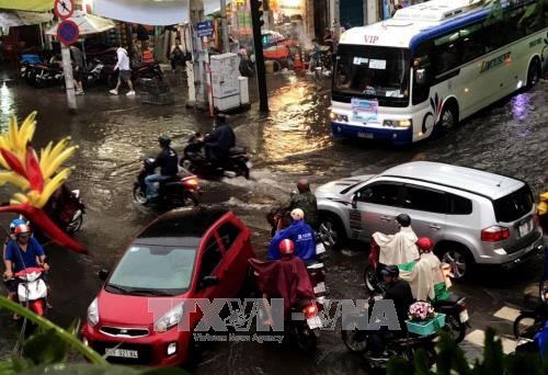 Các phương tiện giao thông di chuyển khó khăn do nước ngập tại khu vực ngã tư đường Calmette, Quận 1, TP Hồ Chí Minh.