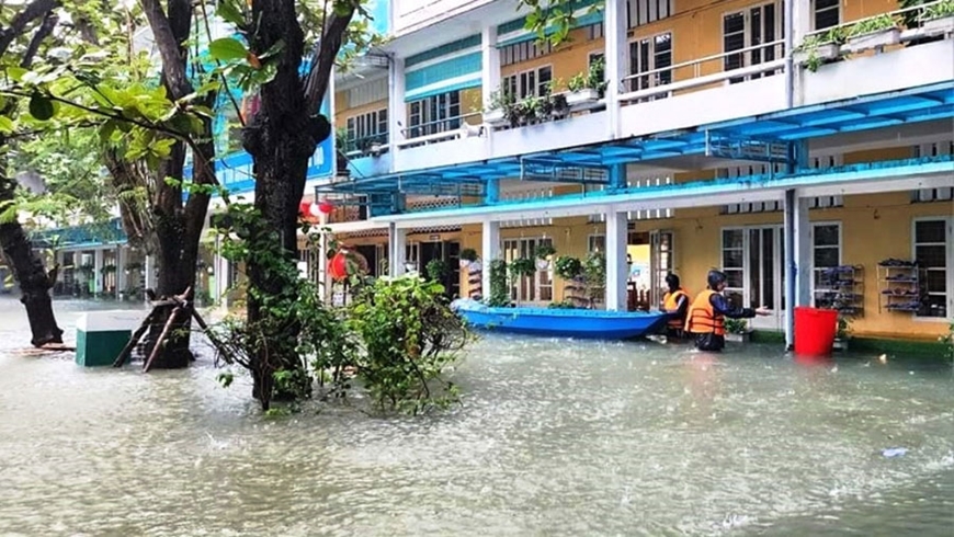| Nhiều trường học tại thành phố Huế bị nước lũ ngập sâu gần 1m, học sinh phải nghỉ học. Ảnh: Báo Nhân Dân |