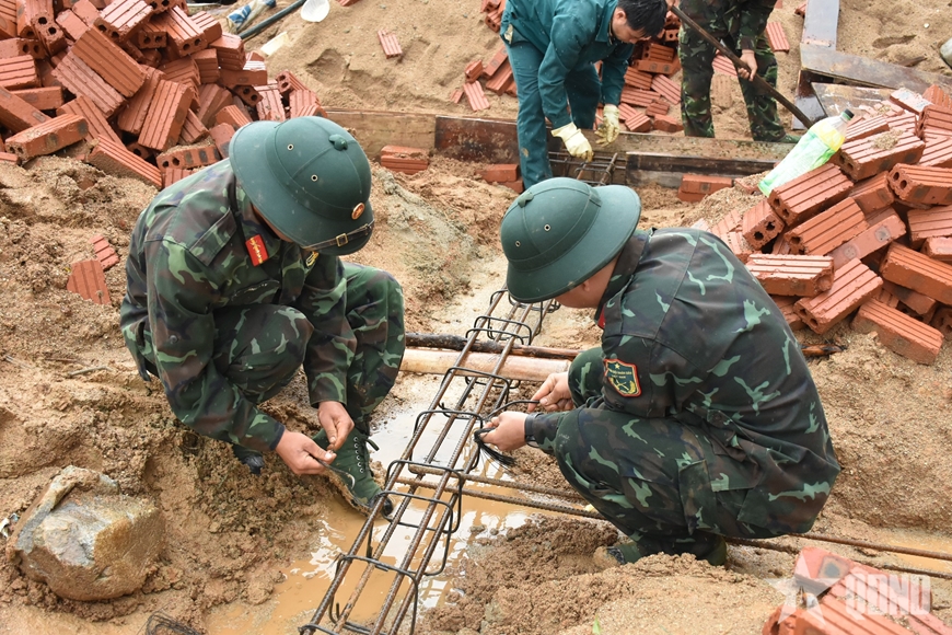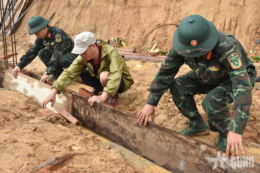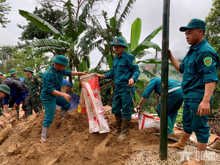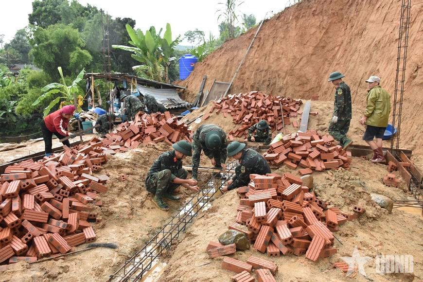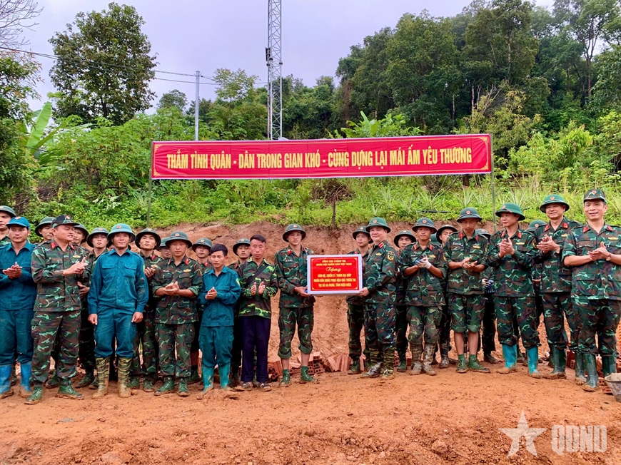 Cán bộ, chiến sĩ, lực lượng dân quân hỗ trợ xây dựng nhà ở cho các hộ dân bị thiệt hại do thiên tai tại xã Xa Dung. |