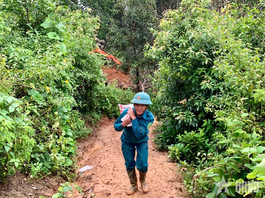 Cán bộ, chiến sĩ, lực lượng dân quân gùi từng bao cát hỗ trợ người dân xây nhà tại xã Xa Dung. |