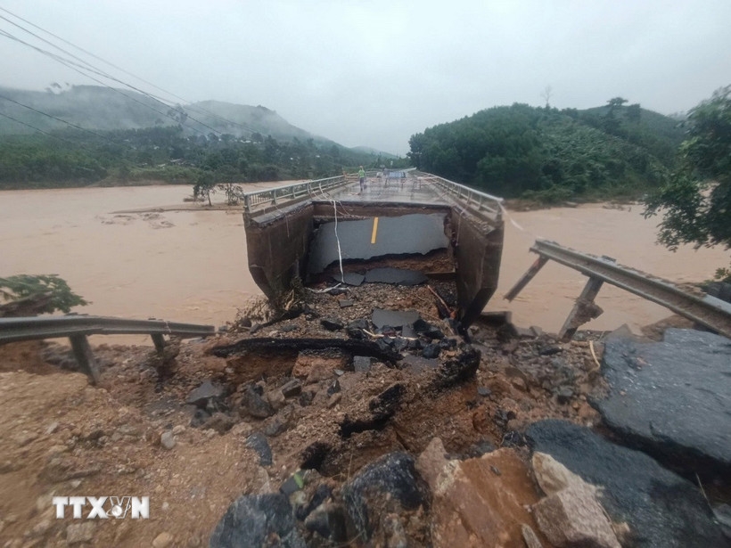| Cầu Ca Da trên quốc lộ 24C đã bị hư hỏng nặng, khiến giao thông bị gián đoạn. Ảnh: TTXVN |
