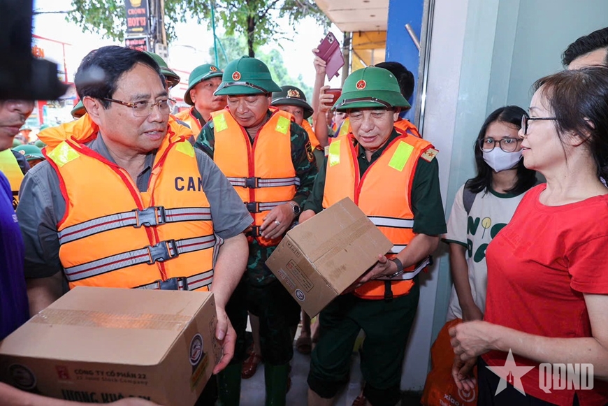 Thủ tướng Phạm Minh Chính, Đại tướng Phan Văn Giang tặng quà bà con vùng ngập lụt. |
