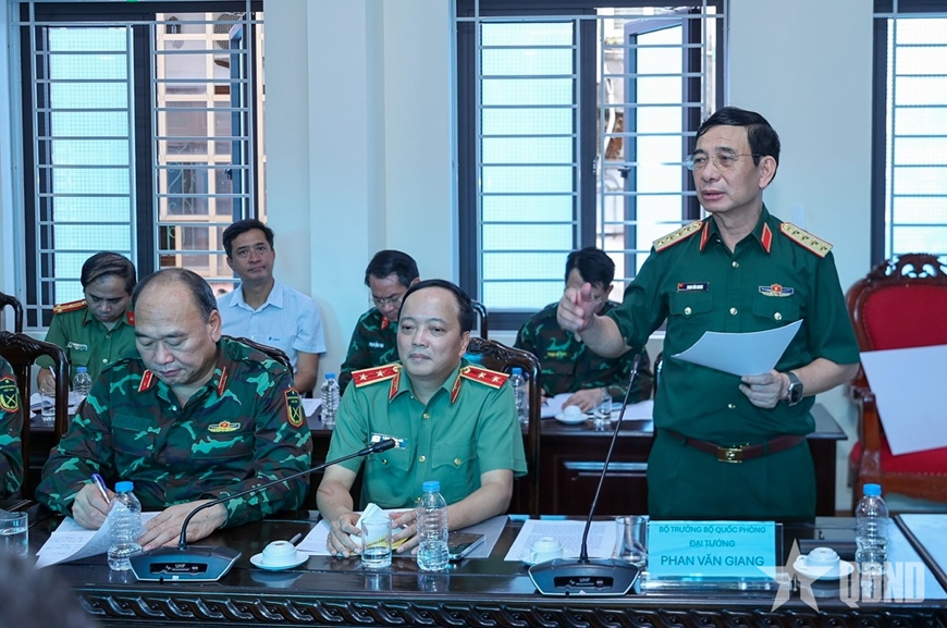 Đại tướng Phan Văn Giang, Ủy viên Bộ Chính trị, Phó bí thư Quân ủy Trung ương, Bộ trưởng Bộ Quốc phòng phát biểu. Ảnh: HOÀNG NAM |