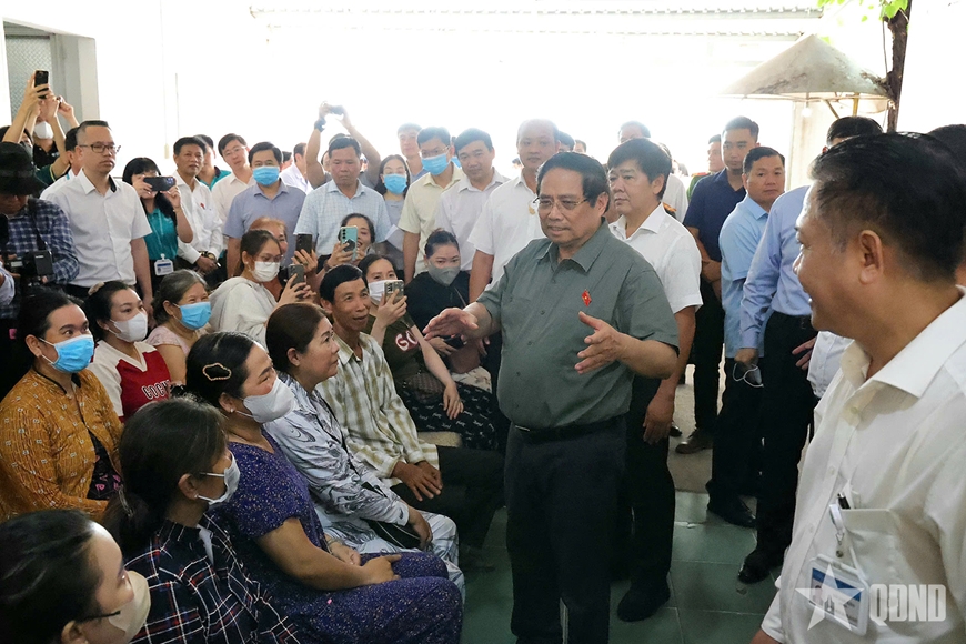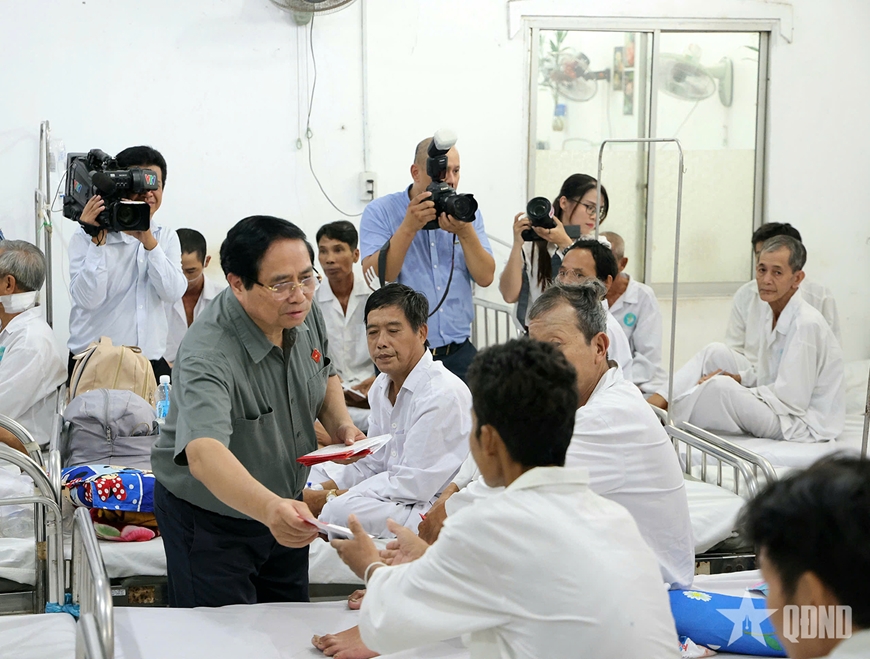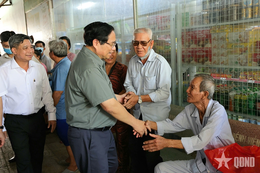 Thủ tướng Phạm Minh Chính thăm, động viên bệnh nhân đang điều trị tại Bệnh viện Ung bướu TP Cần Thơ. |
