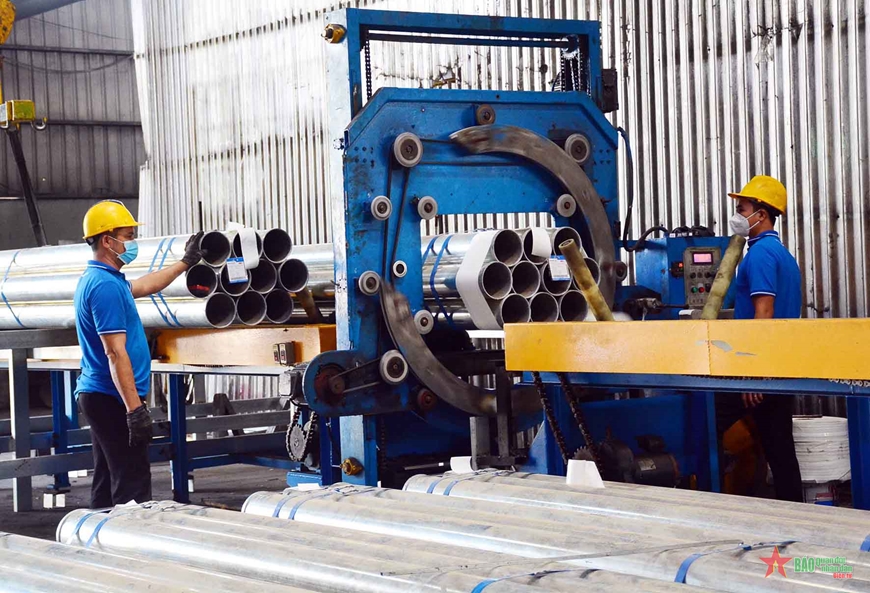 | Công nhân làm việc tại Công ty Cổ phần Sản xuất Thép VinaOne, huyện Bến Lức, Long An. |