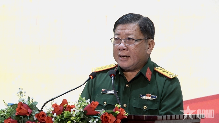Đại tá Lê Hoàng Giữ, Phó chủ nhiệm Chính trị Quân khu 9 phát biểu tại buổi phát động.