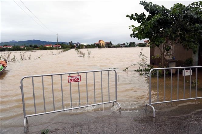 Mưa lũ khiến đường vào thôn Đồng Tư (xã Ninh Châu, Quảng Trị) nước ngập sâu, gây cô lập 300 hộ dân. Ảnh: TTXVN