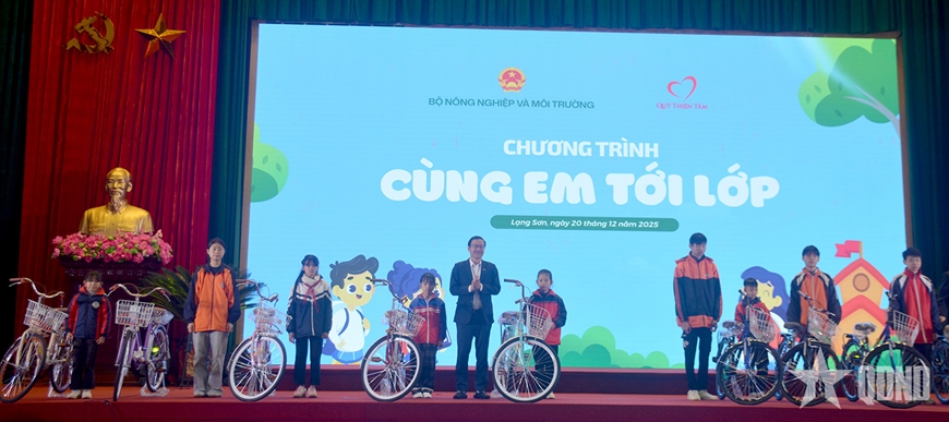 | Lãnh đạo Báo Nông nghiệp và Môi trường trao xe đạp tặng các cháu học sinh. |