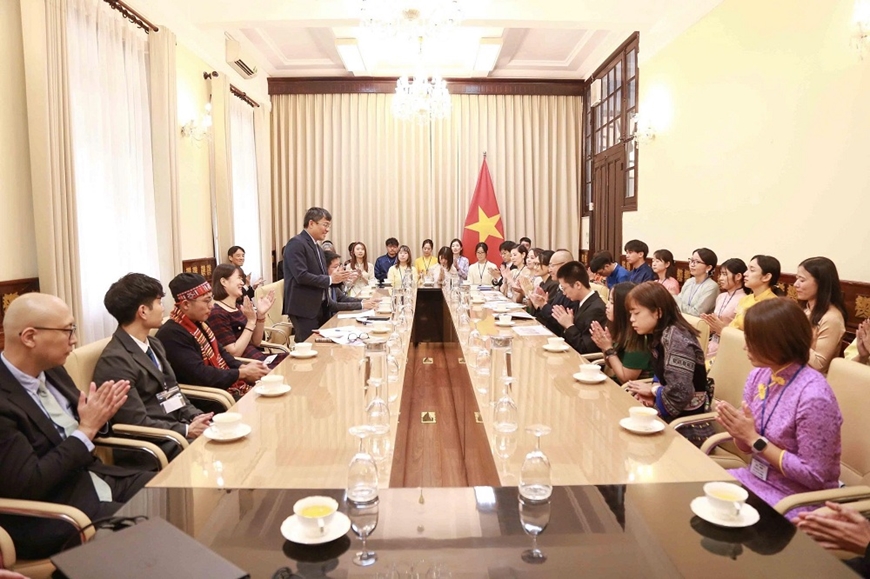Thứ trưởng Ngoại giao Nguyễn Minh Vũ chụp ảnh lưu niệm cùng đoàn tình nguyện viên JICA tại Bộ Ngoại giao. Ảnh: TRUNG HIẾU