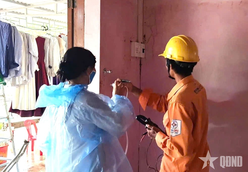 Nhân viên Điện lực miền Trung hỗ trợ kiểm tra sửa chữa hệ thống điện sau công tơ và hướng dẫn sử dụng điện an toàn, tiết kiệm cho các hộ dân sau mưa lũ.