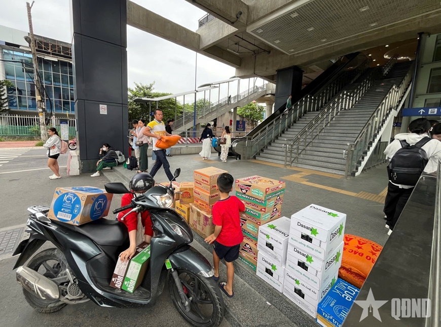 | Nhà ga metro trở thành điểm tiếp nhận hàng hóa hỗ trợ bà con vùng lũ. |