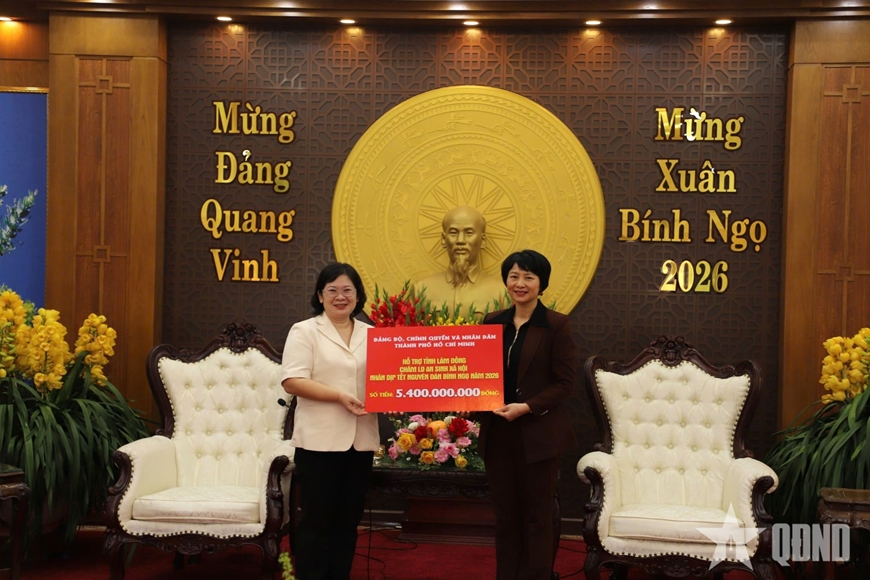 | Đồng chí Văn Thị Bạch Tuyết (bên trái) trao biểu trưng số tiền TP Hồ Chí Minh tặng tỉnh Lâm Đồng trong dịp Tết Bính Ngọ 2026. |