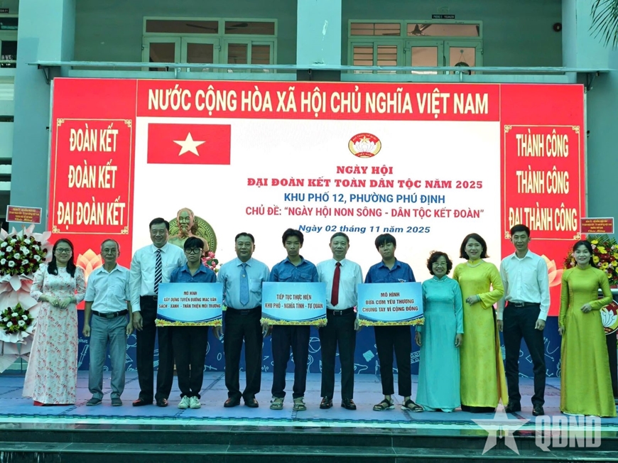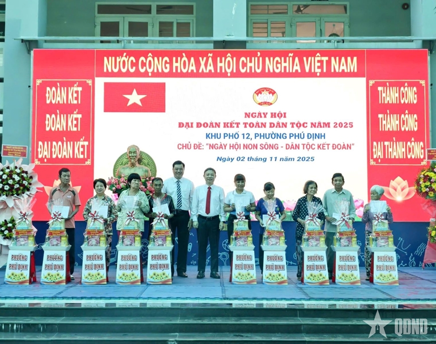 Tại ngày hội, lãnh đạo các cấp đã biểu dương, khen thưởng 21 gương “Người tốt, việc tốt” và 7 “Gia đình văn hóa tiêu biểu” của khu phố. Bên cạnh đó, phường Phú Định và khu phố 12 đã tặng 30 phần quà và 500 suất ăn “0 đồng chia sẻ yêu thương” cho các hộ cận nghèo và người có hoàn cảnh khó khăn; khởi công sửa chữa nhà “Đại đoàn kết” cho 1 hộ dân tộc Hoa. Tổng kinh phí khen thưởng và chăm lo an sinh xã hội gần 86 triệu đồng.