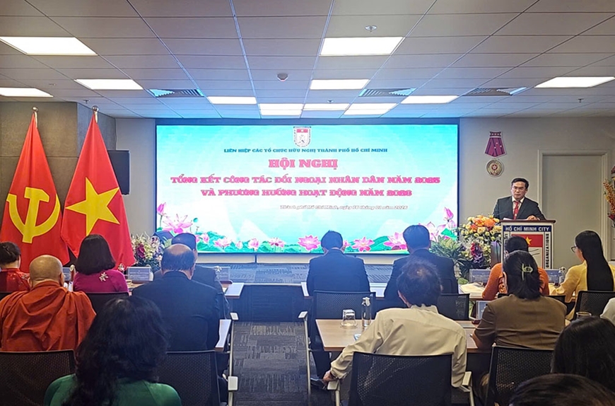 Phát biểu chúc mừng, ông Nguyễn Lộc Hà, Phó chủ tịch Thường trực UBND TP Hồ Chí Minh ghi nhận, đánh giá cao công tác đối ngoại nhân dân của Thành phố năm 2025 đạt nhiều kết quả tốt đẹp, là một trong ba trụ cột đối ngoại và có những dấu ấn đậm nét - ghi dấu 75 năm ngày truyền thống Đối ngoại nhân dân Việt Nam. Năm 2025, công tác đối ngoại nhân dân Thành phố được tổ chức phong phú, đa dạng với hơn 100 hoạt động, sự kiện đối ngoại, đón tiếp đoàn khách quốc tế, tạo thêm nhiều không gian tạo thêm nhiều không gian, diễn đàn giao lưu nhân dân đầy ý nghĩa, thắt chặt thêm sự gắn kết và đồng hành của bạn bè quốc tế trong các hoạt động của Thành phố Hồ Chí Minh…