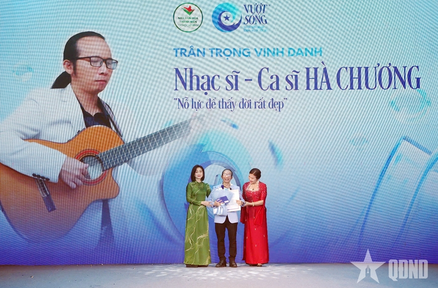 | Ban tổ chức trao vinh danh cho nhạc sĩ, ca sĩ Hà Chương. |