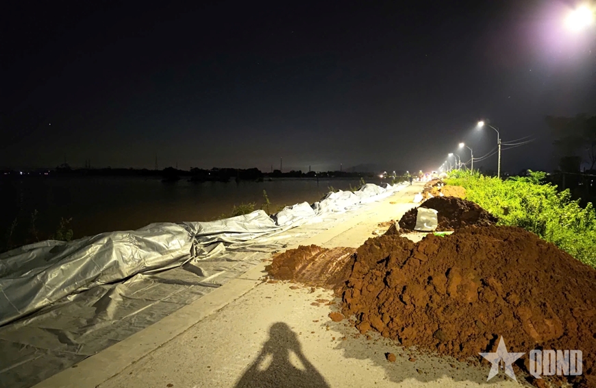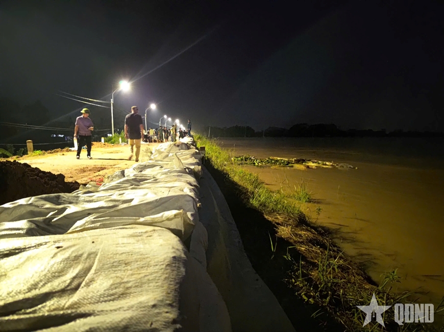 Từ khoảng 19 giờ, lực lượng chức năng tiến hành hạn chế các phương tiện qua lại khu vực đê sông Cầu có nguy cơ bị tràn cao để gia cố.
