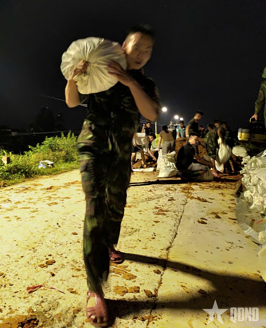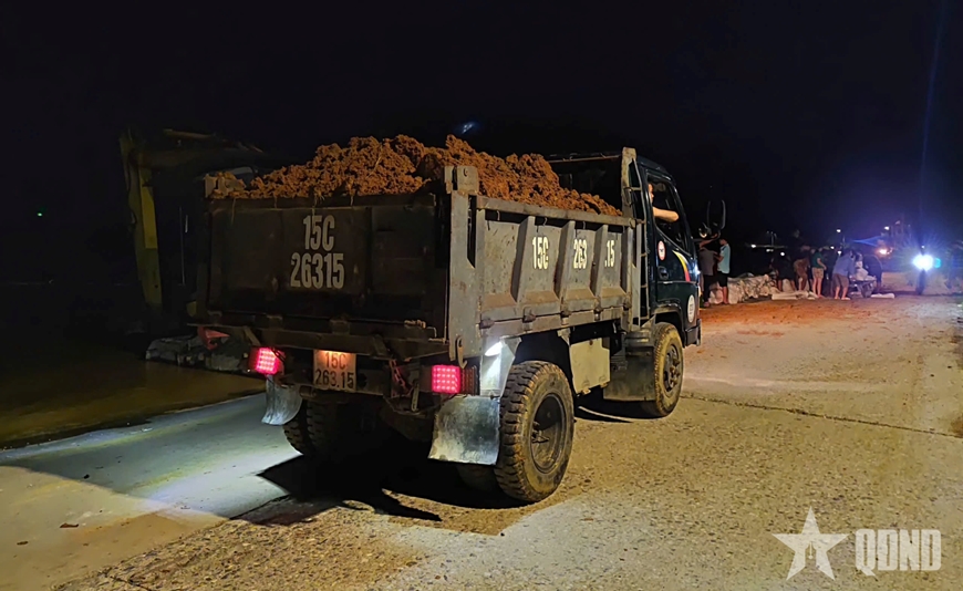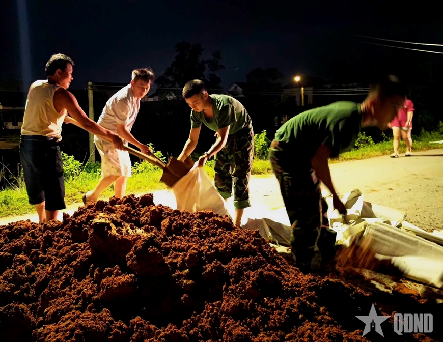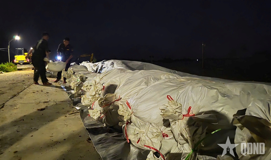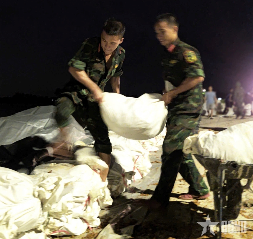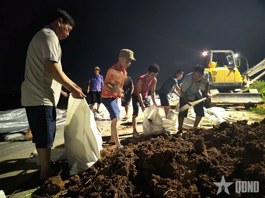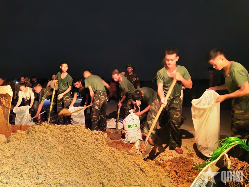 Với sự tham gia của người dân và bộ đội Trung đoàn 209, việc gia cố đê được tiến hành nhanh hơn. |