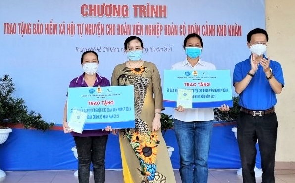 | Đại diện Liên đoàn Lao động TP Hồ Chí Minh và các đại biểu trao thẻ bảo hiểm tự nguyện tặng nghiệp đoàn khó khăn.