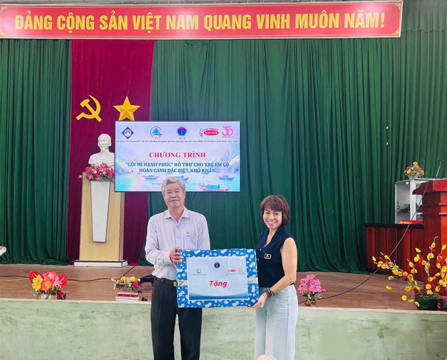 | Bà Lê Lệ Hoa - Trưởng phòng Hỗ trợ trẻ em và Quản lý dịch vụ, Quỹ Bảo trợ trẻ em Việt Nam tặng quà Trường trẻ em khuyết tật An Giang - cơ sở thụ hưởng từ dự án "Gói mỳ hạnh phúc". |