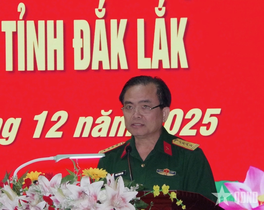 Đại tá Phan Thanh Tâm, Phó chỉ huy trưởng Bộ CHQS tỉnh Đắk Lắk phát biểu.